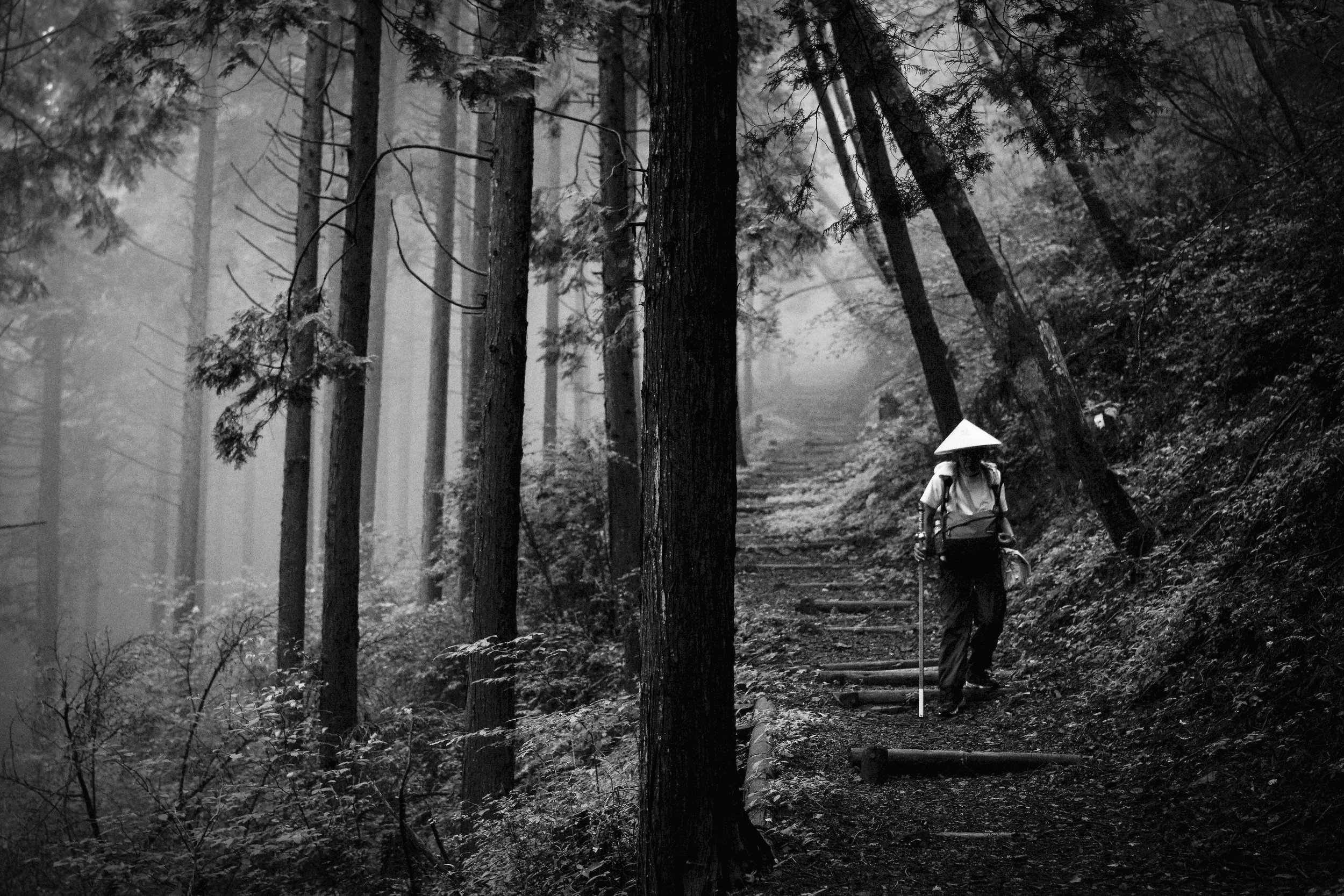 A hiker wearing a traditional Asian conical hat and using a walking stick hikes up a wooded trail through a misty forest.